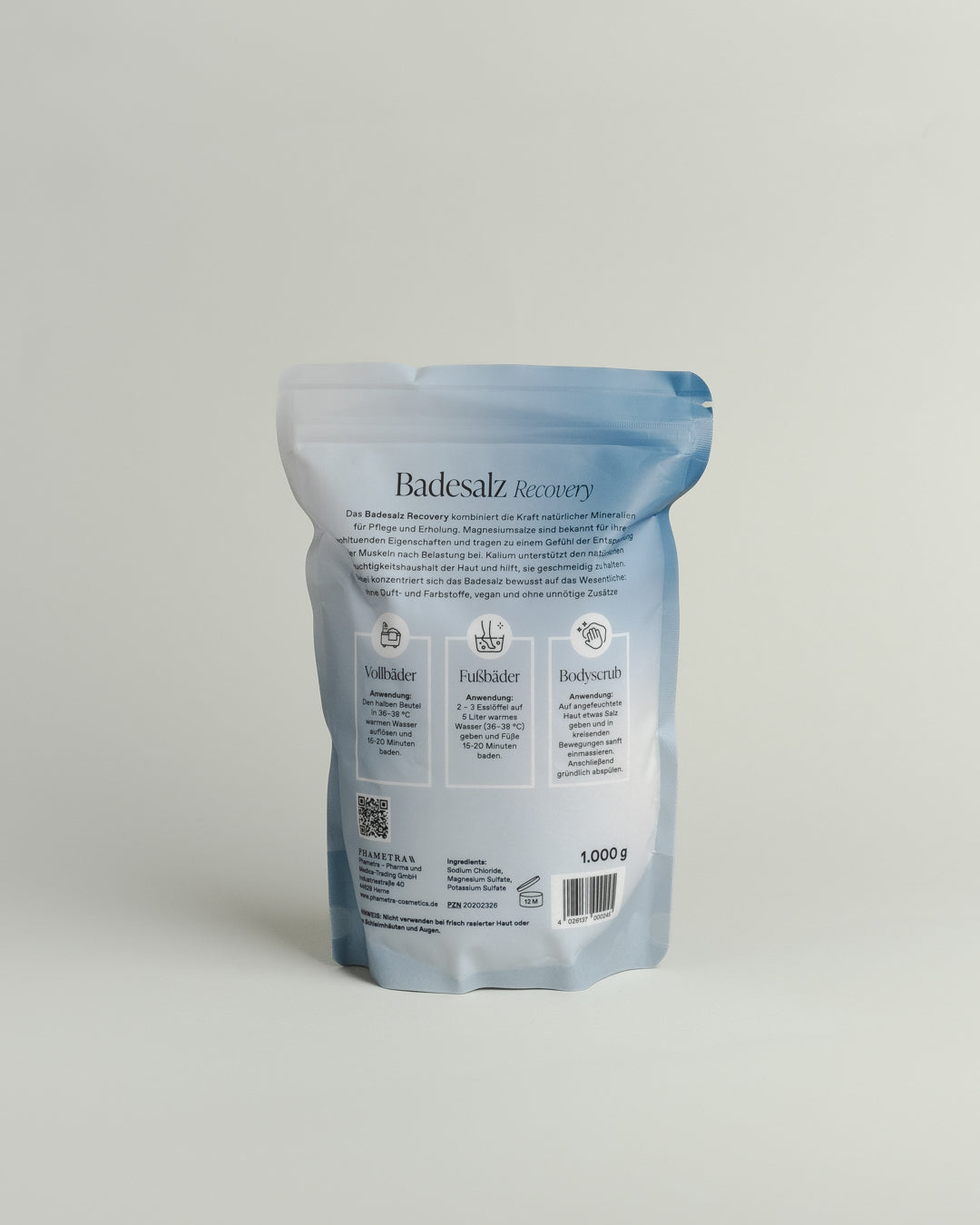 Das Badesalz Recovery löst sich im warmen Wasser auf und setzt wertvolle Mineralien frei. Magnesium trägt zu einem Gefühl der Entspannung nach Belastung bei, während Kalium die Haut in ihrem natürlichen Feuchtigkeitshaushalt unterstützt. So entsteht ein wohltuendes Pflegebad, das Haut und Körper gleichermaßen verwöhnt.